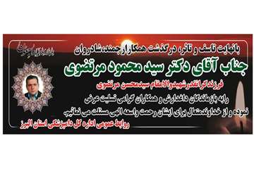 درگذشت همکار گرامی و ارجمند شادروان، دکتر سید محمود مرتضوی فرزند شهید والا مقام سید محسن مرتضوی را به مجموعه بزرگ اداره کل دامپزشکی استان البرز تسلیت عرض نموده و از درگاه خداوند متعال برای آن مرحوم رحمت و مغفرت الهی و برای بازماندگان صبر و شکیبایی مسئلت مینماییم.