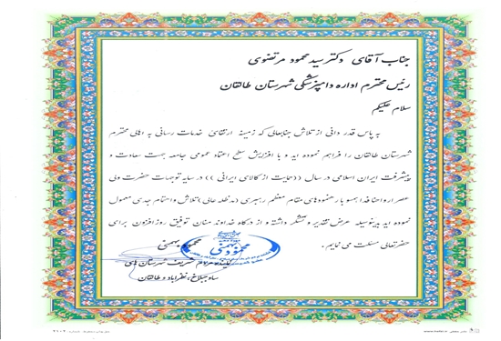 به پاس قدردانی از تلاش جنابعالی که زمینه ارتقای خدمات رسانی به اهالی محترم شهرستان طالقان را فراهم نموده اید و با افزایش سطح اعتماد عمومی جامعه جهت سعادت و پیشرفت ایران اسلامی در سال حمایت از کالای ایرانی در سایه توجهات حضرت ولی عصر ارواحنافدا همسو با رهنمودهای مقام معظم رهبری (مدظله عالی) تلاش و اهتمام جدی معمول نموده اید بدینوسیله عرض تقدیر و تشکر داشته و از درگاه خداوند منان توفیق روزافزون برای حضرتعالی مسئلت می نمایم.